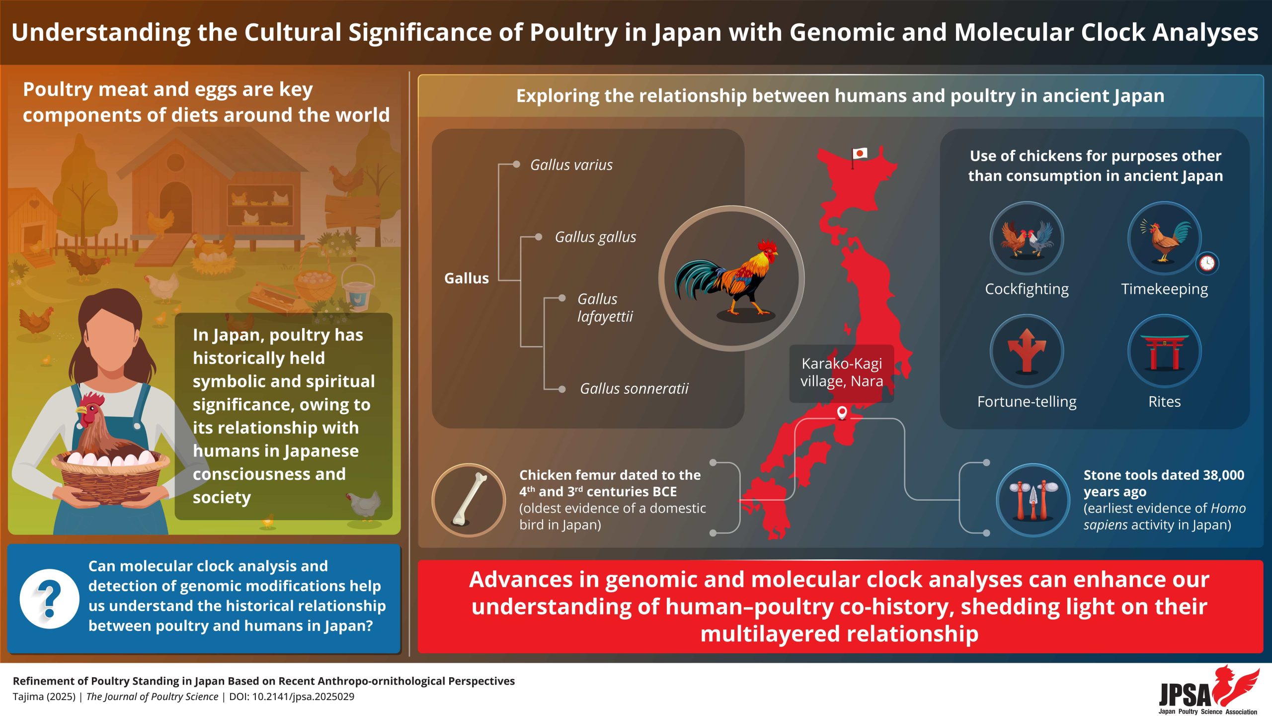A review published online in Volume 62 of The Journal of Poultry Science on September 25, 2025, examines how recent advancements in genomic and molecular clock analyses can refine our understanding of the unique relationship between humans and chickens in Japan. The study was conducted by Professor Emeritus Atsushi Tajima, University of Tsukuba, Japan. Beyond an evolutionary perspective, the review explores this multilayered relationship by examining the anthropological, ornithological, ritualistic, mythic, and artistic aspects of Japanese society.